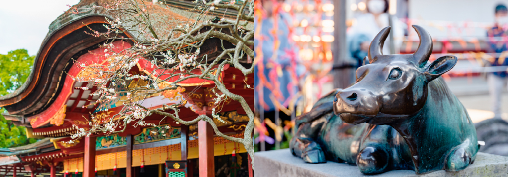 学問の神・天神様(菅原道真)の使いである牛の石像をなでて、志望校合格や学業成就などを祈る習わし。「なで牛」は京都の北野天満宮や東京の湯島天満宮をはじめ、全国各地に点在しています。